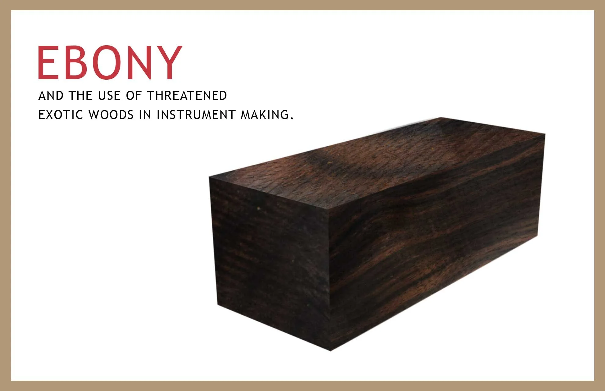 Art and Music are perhaps the most beautiful part of the human experience; they awaken our spirits and bring joy to the entire planet. It is purely uplifting in its expression of our souls and the very fact that we dedicate such a large portion of our lives to the creation of art or the expression of music that we enhance the human experience. To consider that doing so should bring a negative impact on the other species of our world seems contrary to the very idea of art that it behooves us as creators of instruments and makers of music to consider our impact on the planet in the work that we do.